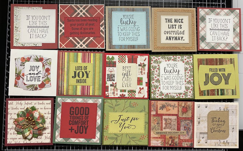 seen here) So, I ended up using deco scissors to trim the outside edges of the mat I gave mine and they don't cut completely anymore after all these years so, I took the point of some other scissors trying to "fix" the cuts, and after a while just grabbed some Antique linen distress Oxide to color dust along the edges. The holly here is a sticker that has an almost "felted" texture to it, it was a gift from June for my birthday this year, it came with some Poinsettias in the pack too from Hobby lobby. The sentiment here is from Tim Holtz great outdoors set.