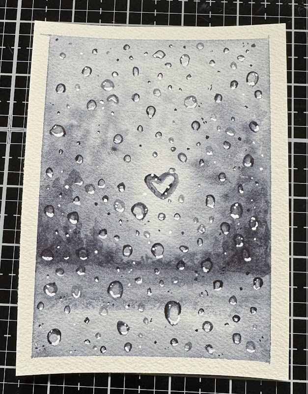 This morning I added just a little bit more bleed proof white to the maybe the highlights section of the tops of the drops and the heart trail and a few just white drops in the glass. I know I have a sentiment that reads I miss you Most on Rainy days but, I am trying to decide if I want to take away from any of the painting to add that to a front of a card with this. I may just add that to the inside of the card. We shall see today after work.